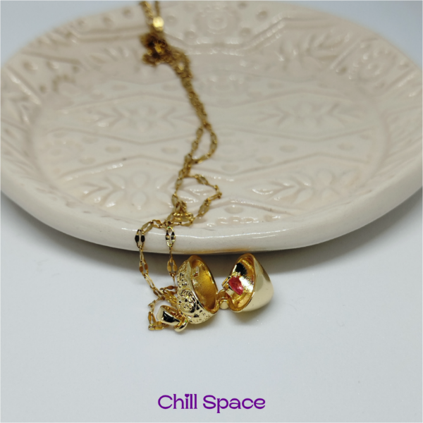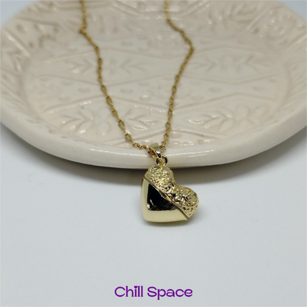 Cadena de acero quirúrgico dorado con un delicado corazón que se abre y adentro de el tenemos un mini corazoncito de piedrita rosa